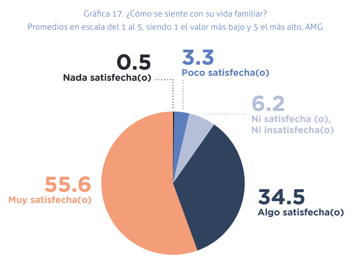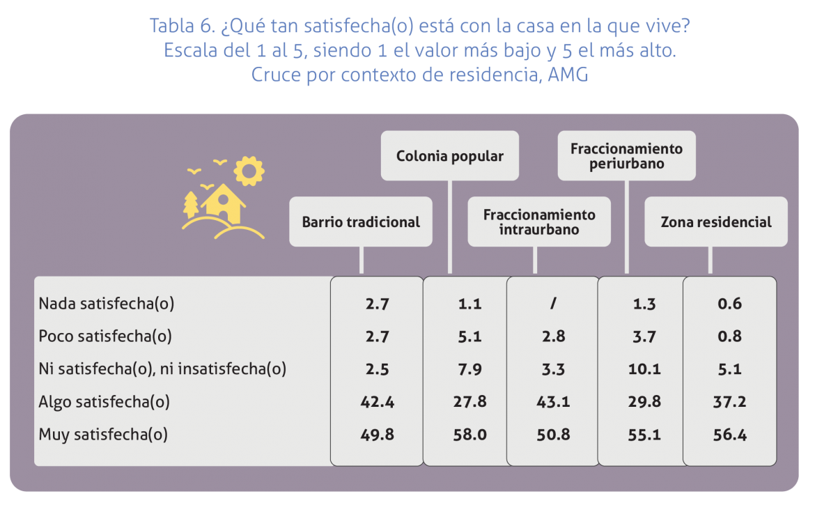 La muestra de la encuesta alcanza para saber del bienestar de la juventud a escala metropolitana, con distribución de género y subgrupos etarios, con otras dos características destacables: la división en estratos socioeconómicos (bajo, medio, alto) y por contexto de residencia: barrio tradicional, colonia popular, fraccionamiento intraurbano, fraccionamiento periurbano, zona residencial (la nota metodológica es extensa, en ella queda definida cada una de estas categorías). De esta manera podemos encontrar que, por ejemplo, la satisfacción con la vida difiere según la morfología del espacio urbano en el que está la vivienda y, por supuesto, inciden las características de ésta. La ciudad no es una entidad uniforme, mirarla a partir de sus distintas fisonomías nos permite entender el papel que juega, o debería jugar, la planeación.